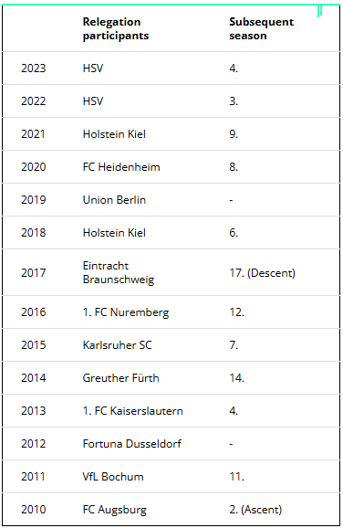 Since the 2010/11 season (!), no team that has failed in the relegation has managed to gain promotion to the Bundesliga in the following season. The last team to do so was FC Augsburg in 2011.
