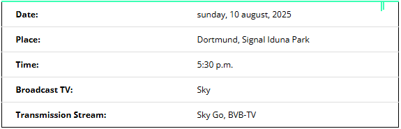The last friendly on BVB’s 2025 summer schedule is a real test for Borussia Dortmund before their first competitive game next weekend in the first round of the DFB Cup. Juventus Turin awaits the Black and Yellows.
