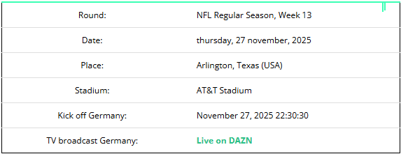 According to the NFL schedule, we will be served a real treat in the night from Thursday to Friday – just in time for Thanksgiving! And I’m really looking forward to my Cowboys Chiefs tip.
