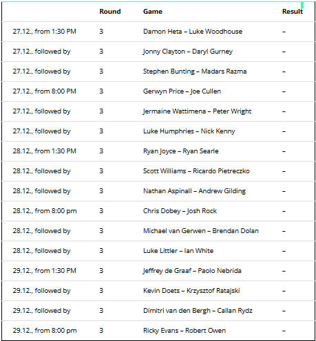 World Darts Championship Schedule and Tournament Tree 3rd Round