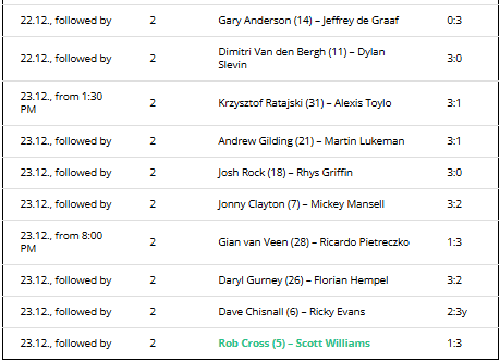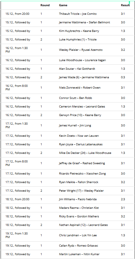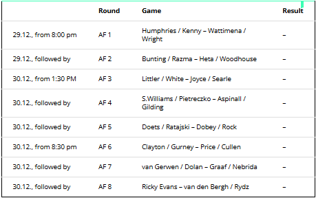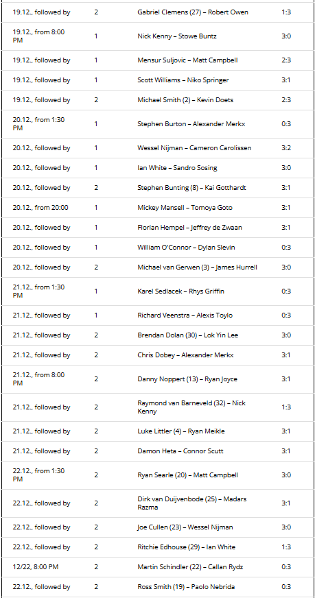 The 1st and 2nd round matches will be played until December 23. After that, the World Darts Championship tournament tree will not resume until after Christmas and the two public holidays. The matches of the fourth round (round of 16) will be played until the turn of the year.