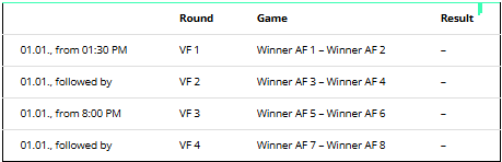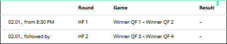 Two matches will take place on January 1st from 13:30, the other two duels will start at 20:30. The mode in the quarter-finals is best of 9 sets, with the winners needing to win 5 sets.