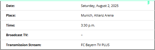 The Bayern – Lyon friendly will take place on Saturday, August 2, at the Allianz Arena in Munich. Kick-off is at 3:30 p.m.
