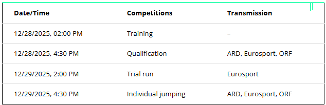 The Oberstdorf kick-off competition will take place on Monday, December 29, 2025, at 4:30 p.m. The day before, on Sunday (28 December), the qualification is scheduled.