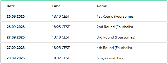 Four foursome and fourball matches will be played on Friday and Saturday mornings and afternoons. On Sunday, the final day, twelve singles matches will follow on the Ryder Cup 2025 schedule.