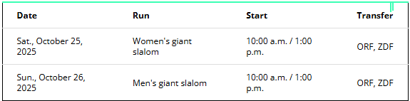 For the two second runs, the Sölden 2025 broadcast will begin at 12:30 p.m., again half an hour before the official start time of 1:00 p.m.