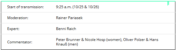 The commentary teams for ORF’s Sölden TV broadcast are Peter Brunner and Nicole Hosp (women) and Oliver Polzer and Hans Knauß (men). The World Cup opener will be hosted by Rainer Pariasek. He will be joined by Benni Raich as the third expert.