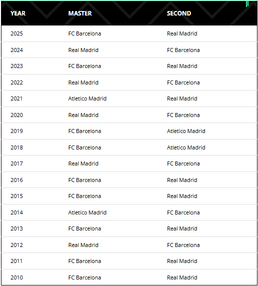 Since 2022, the championship title has alternated between Real Madrid and Barca. In the previous season, the Catalans were ahead (as in 2023) and Real was second. In 2021 and 2023, it was exactly the opposite.