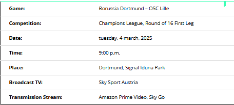 All TV information for the first leg of the Champions League round of 16 between Borussia Dortmund and OSC Lille, including the starting line-up and betting odds.