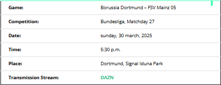 On the 27th Bundesliga match day, Borussia Dortmund will face FSV Mainz 05. The kick-off is on Sunday, March 30, 2025, at 5:30 p.m. The broadcast will be live on DAZN.