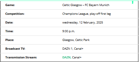 The broadcast of Celtic Glasgow vs. Bayern Munich will be shown live and exclusively in Germany on DAZN from 9:00 p.m. today (February 12).