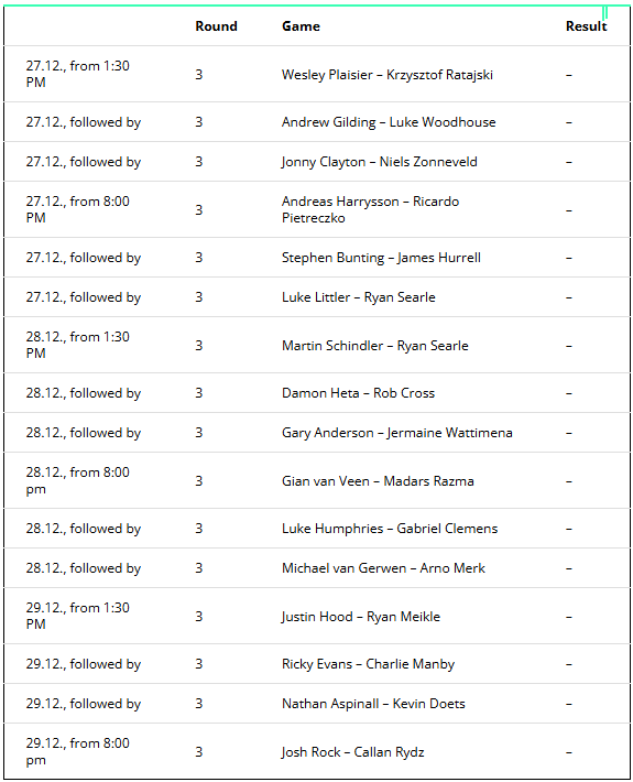 World Darts Championship Schedule and Bracket 3rd Round