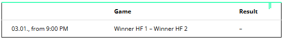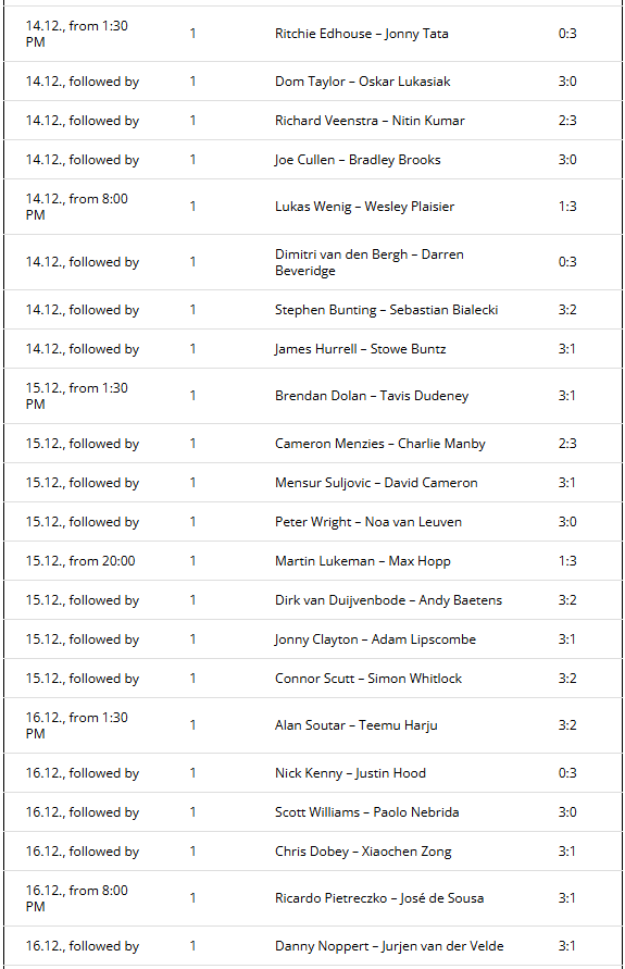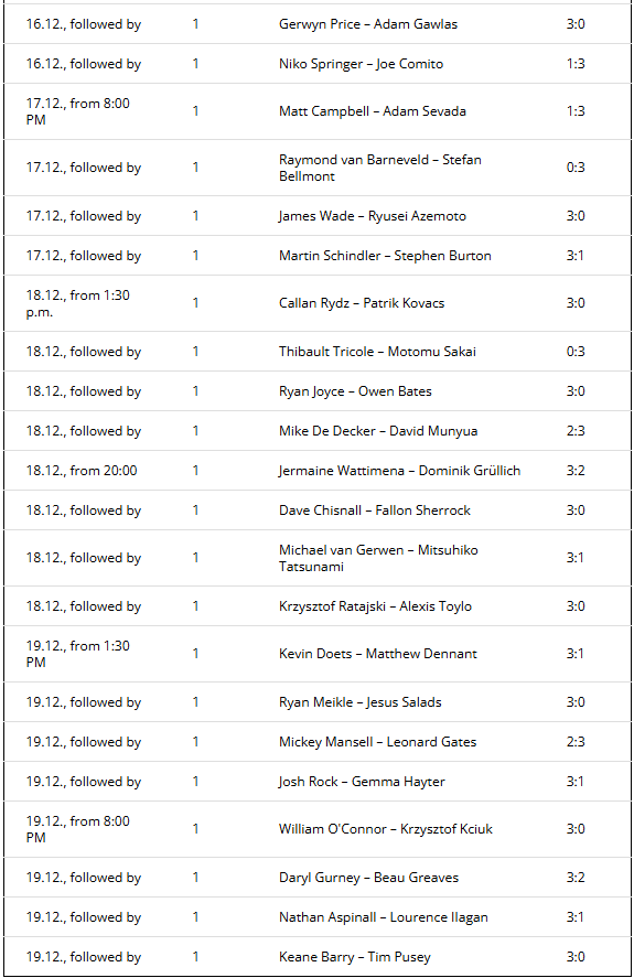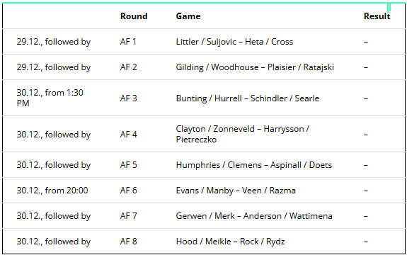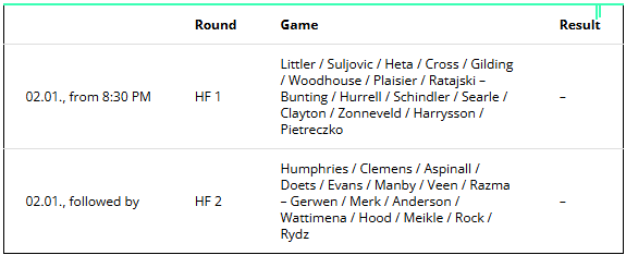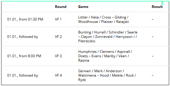 January 1 is also the last day with afternoon and evening sessions. The first two quarter-finals will take place from 1:30 p.m., the remaining two duels will start at 8:00 p.m. The mode is best-of-9 sets.