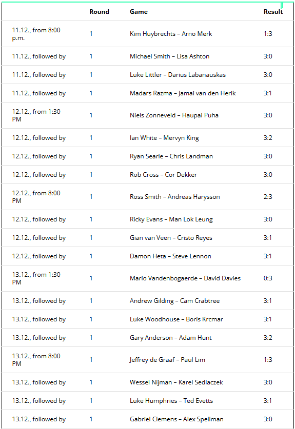 World Darts Championship Schedule: 1st Round